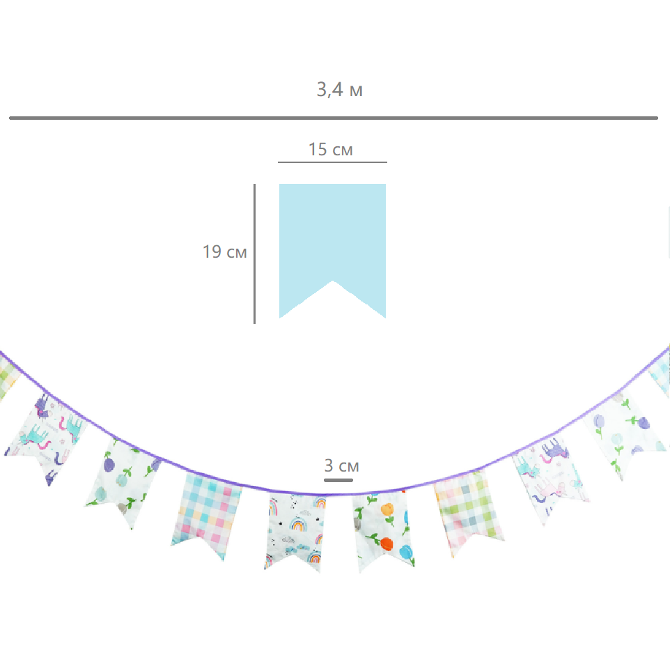 Гирлянда состоит из 12 флажков, общая длина составляет 3,4 м, расстояние между флажками 3 см, длина матерчатых флажков 2,1 м, длина лямок с обеих сторон по 50 см
