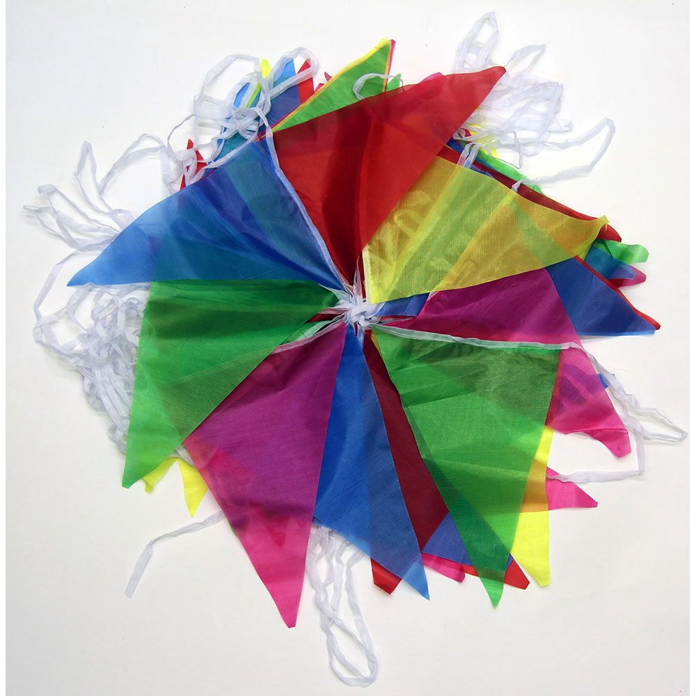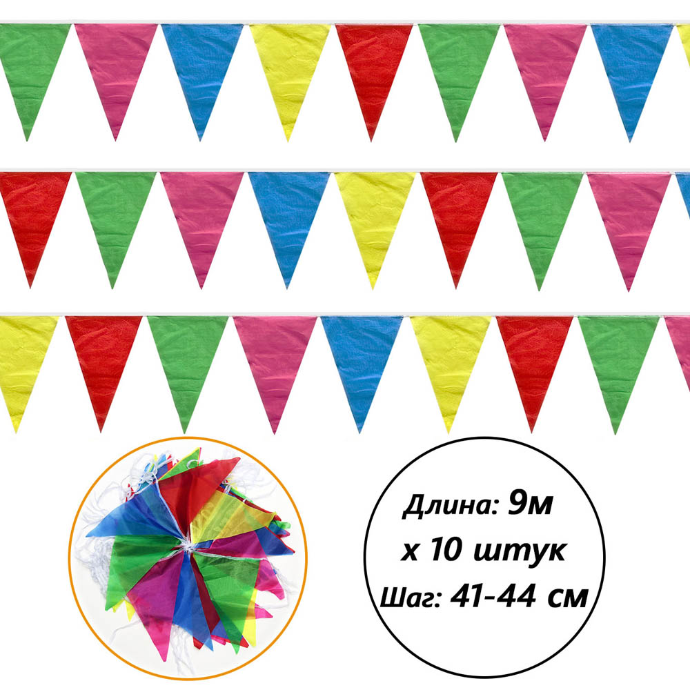 Флажковые гирлянды для уличного и интерьерного декора. Размер одного флажка — 18×30 см. Длина каждой гирлянды составляет 10 метров: флажки размещены на участке длиной 9 м, по 50 см верёвки с каждой стороны для удобного крепления.