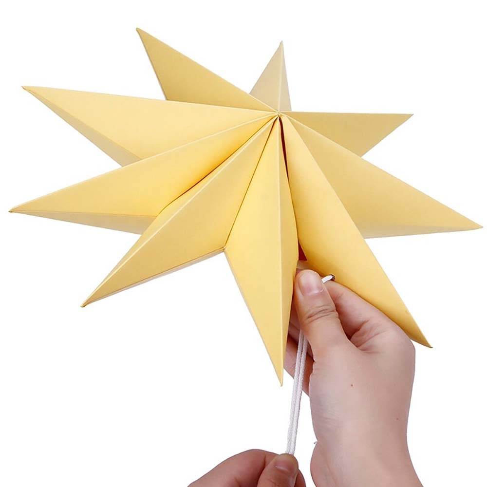 Объёмная декоративная звезда из картона диаметром 30 см с 9 лучами. Оснащена встроенным шнурком для подвешивания. Поставляется в компактном сложенном виде и быстро собирается: специальный шнурок при затягивании придаёт изделию объём и фиксирует форму. После сборки звезда остаётся устойчивой без дополнительных креплений и может использоваться многократно.